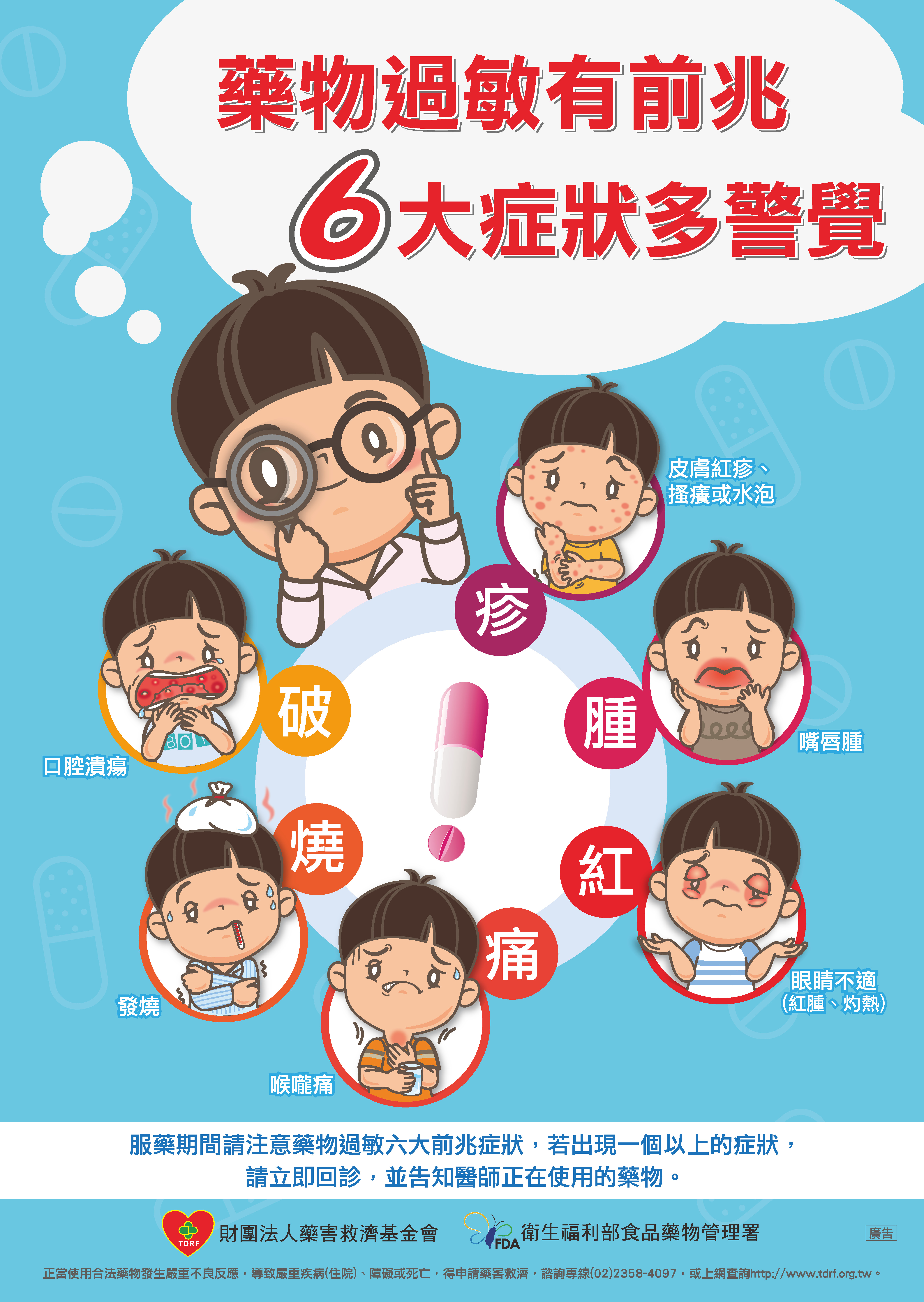 為使藥害能被早期診斷治療,近年食品藥物管理署(下稱食藥署)積極推動民眾認識藥物過敏6大前兆症狀-“疹”、“破”、“痛”、“紅”、“腫”、“燒”,期望有效預防嚴重不良反應發生,本次委託藥害救濟基金會進行的民調顯示,近八成民眾知道皮膚紅疹可能是藥物過敏前兆症狀,但對於黏膜症狀的認知仍有不足;且有七成的民眾誤以為藥物過敏可能只會在用藥後立即發生,而缺乏用藥期間亦可能發生的觀念。
